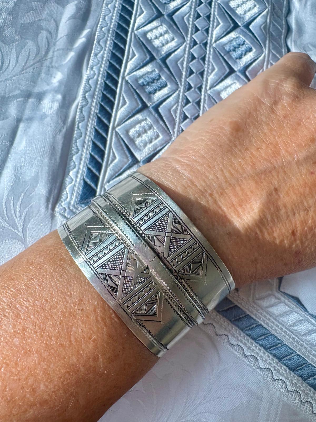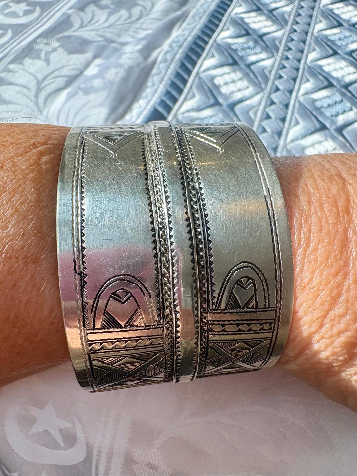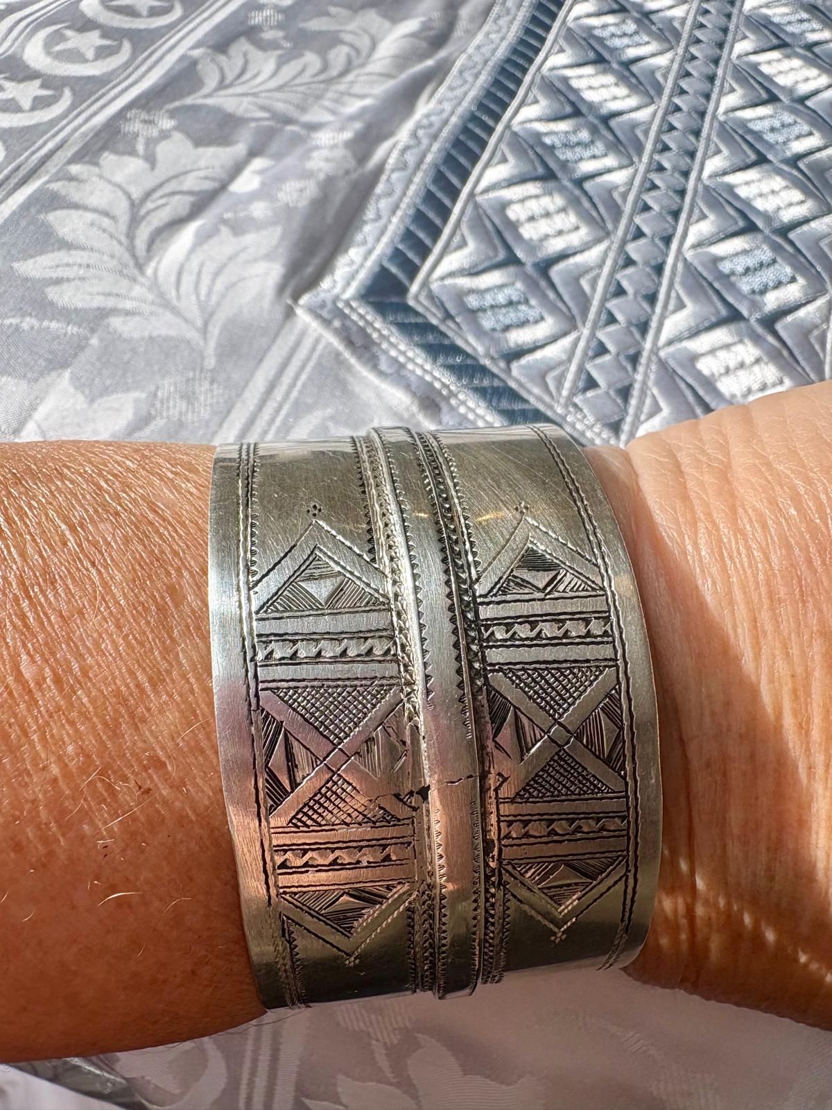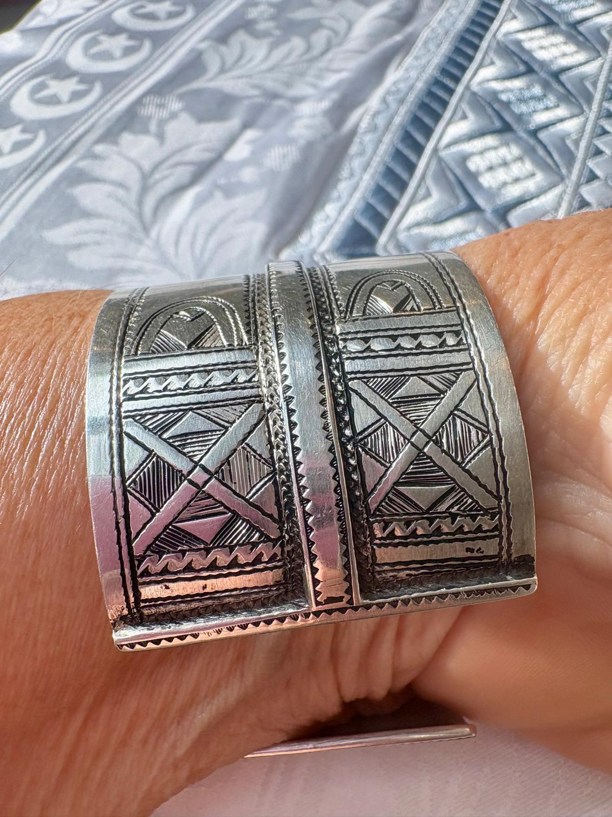 Manchette Touareg en argent, double motif gravé. 17 cm / 3,7 cm. Pièce unique
