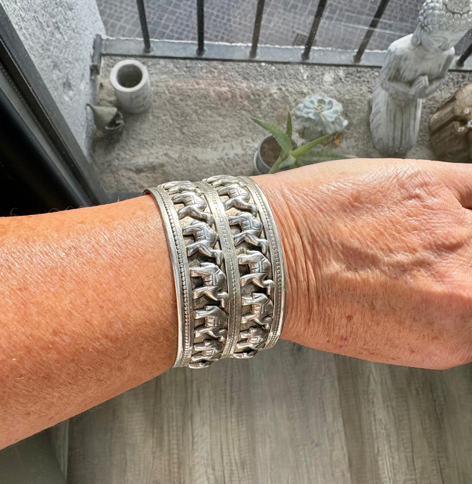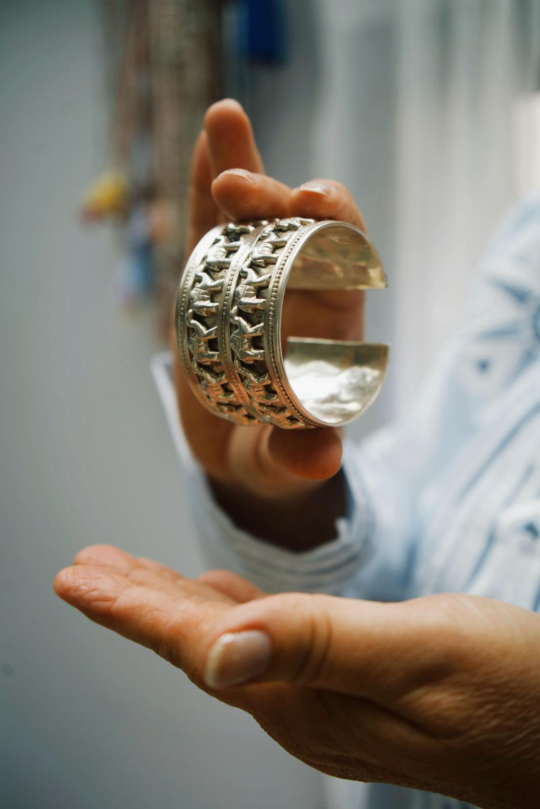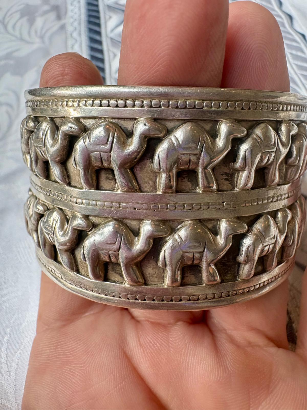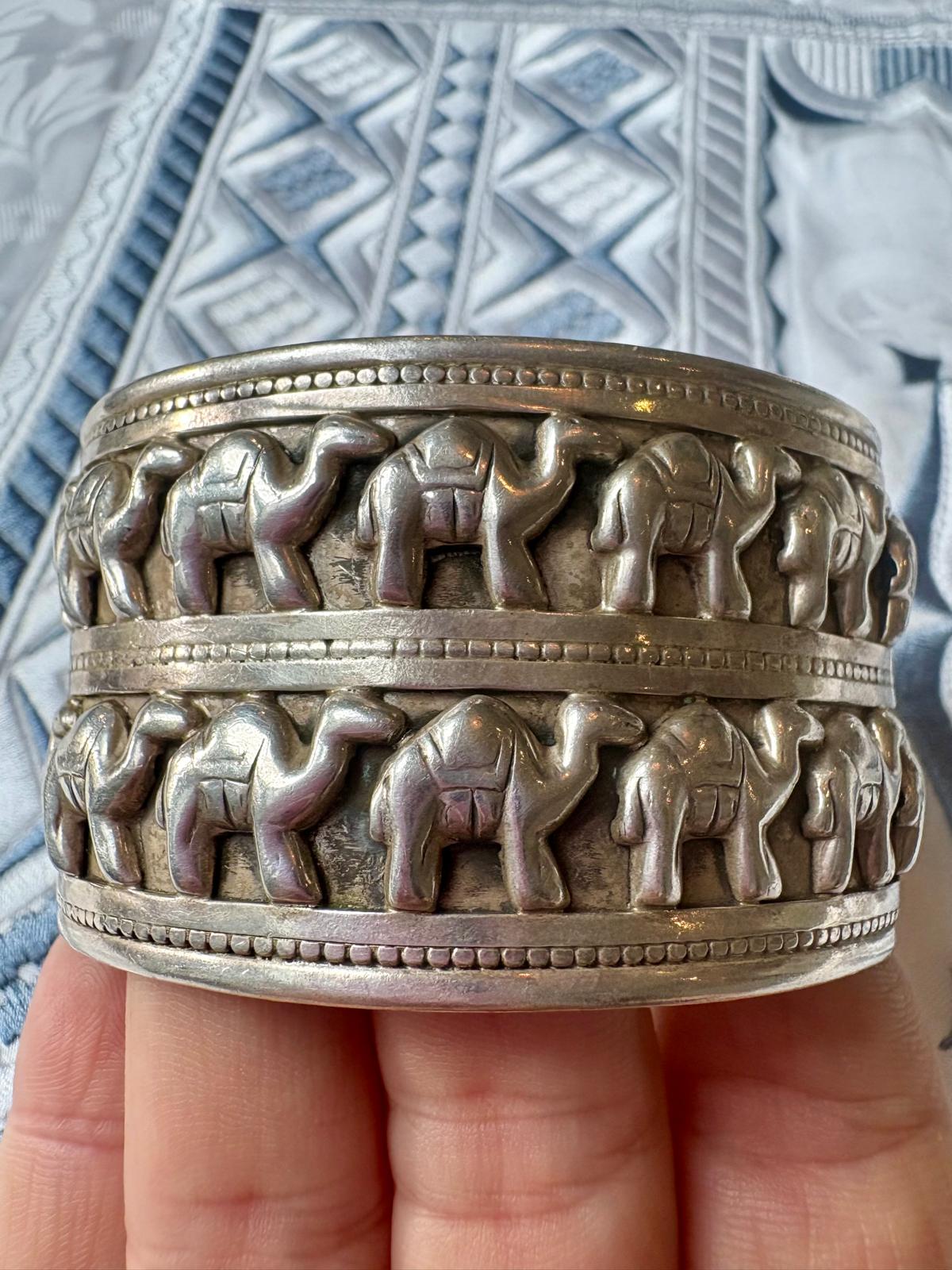 Cette manchette en argent massif, ornée de chameaux finement ciselés, est une pièce unique et rare, chargée de symbolique et d’histoire. Le chameau, animal sacré des déserts, représente la résilience, l’endurance et la capacité à traverser les épreuves avec sagesse.