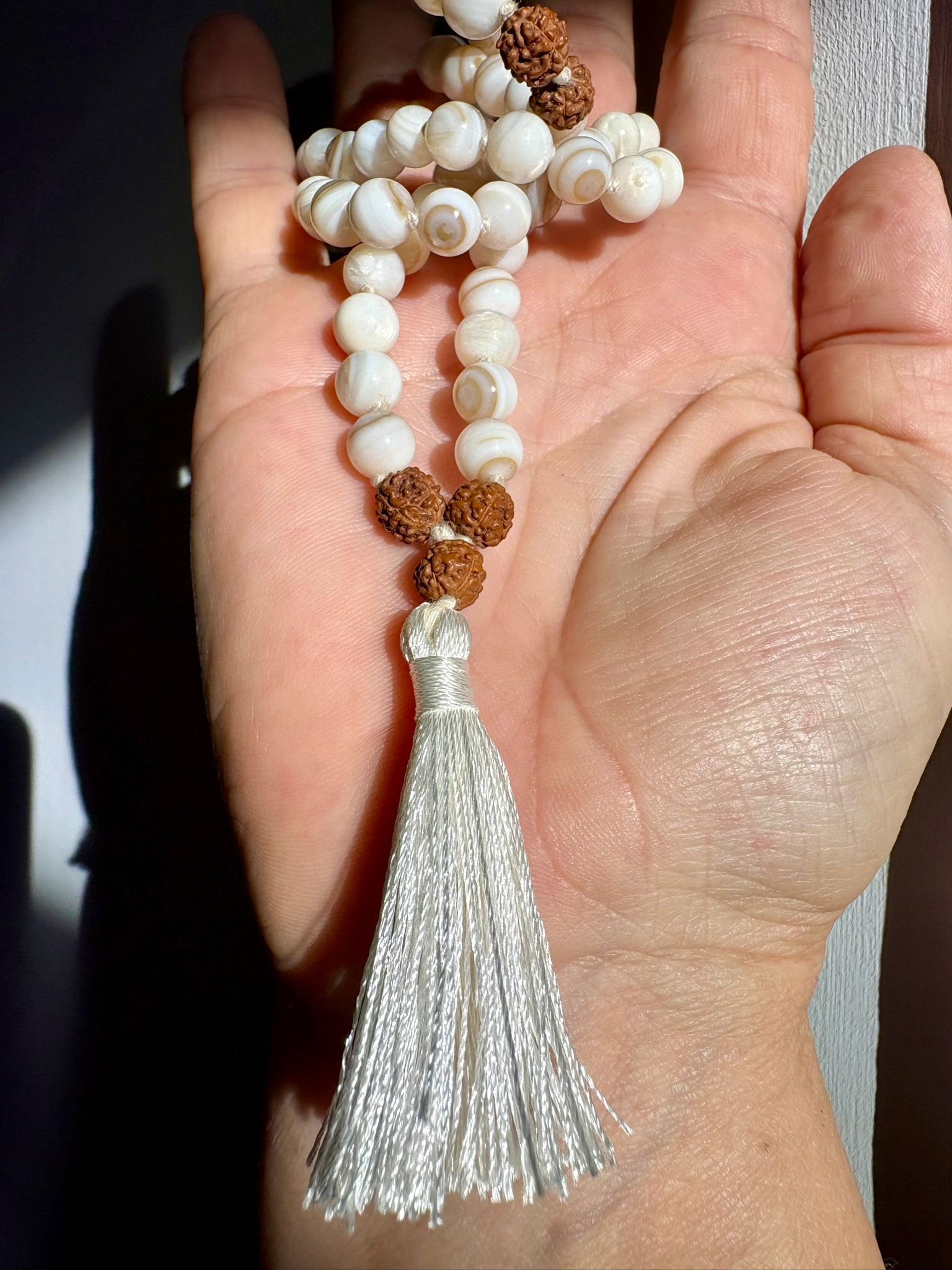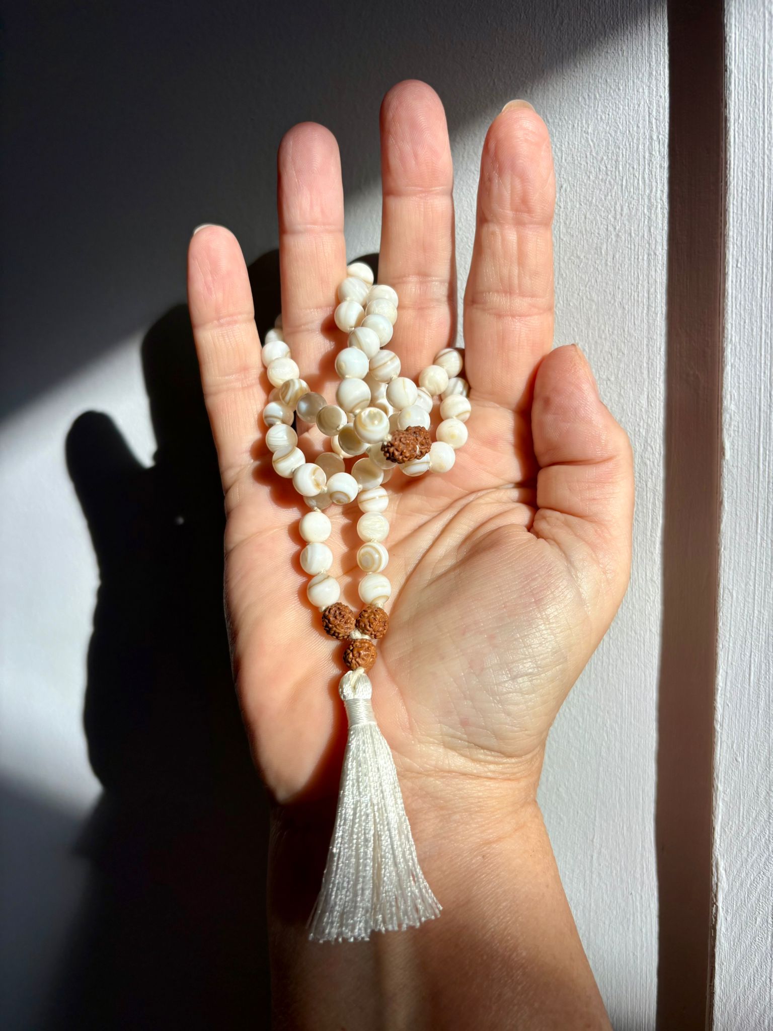 Idéal pour la méditation, les pratiques spirituelles ou comme talisman quotidien, le Mala Mother of Pearl accompagne celles et ceux qui cherchent réconfort, sécurité émotionnelle et douceur intérieure.