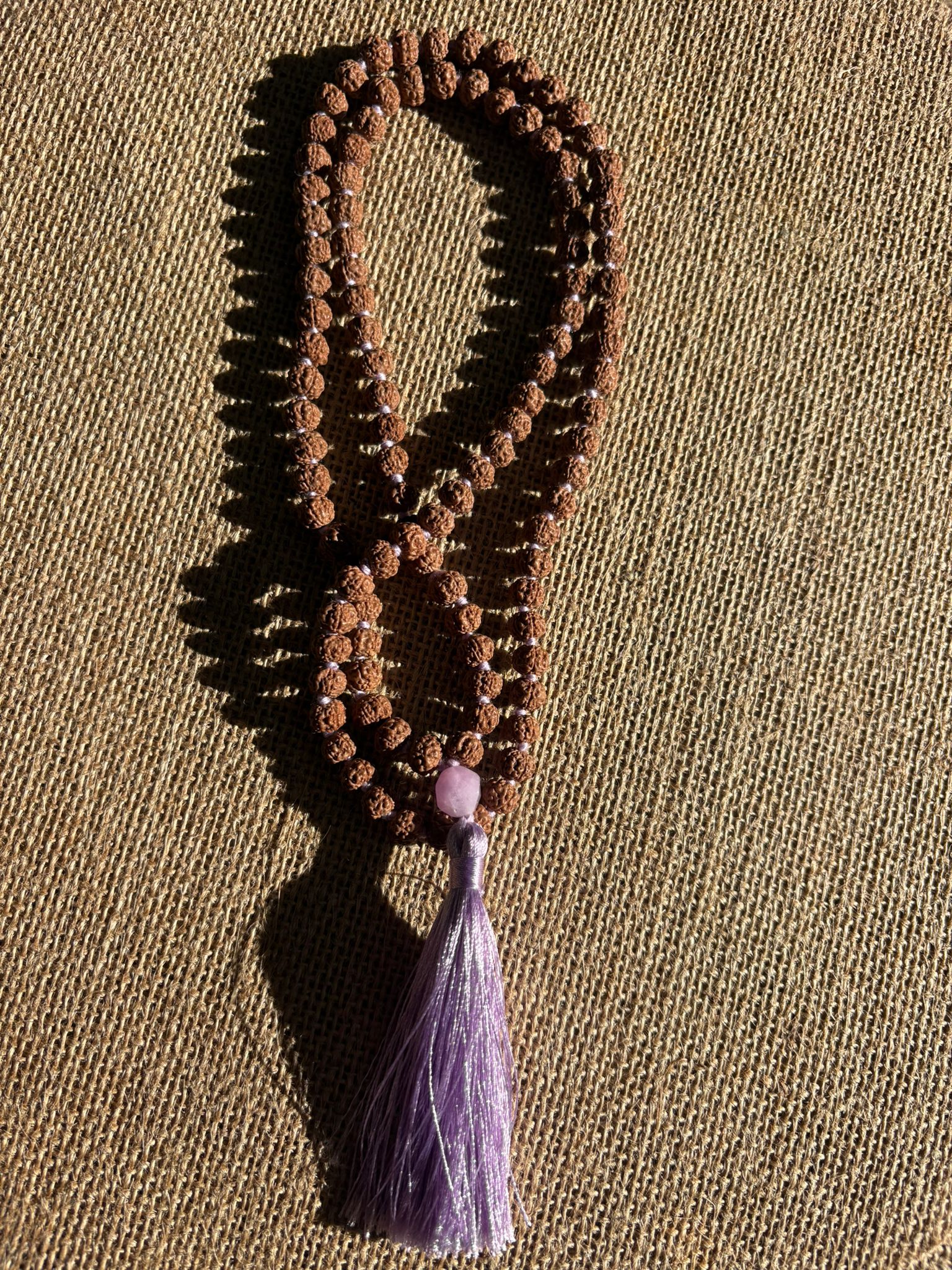 Le pompon lila symbolise la spiritualité, la paix intérieure et la connexion aux plans supérieurs, apportant une touche de douceur et d’élégance à ce mala.