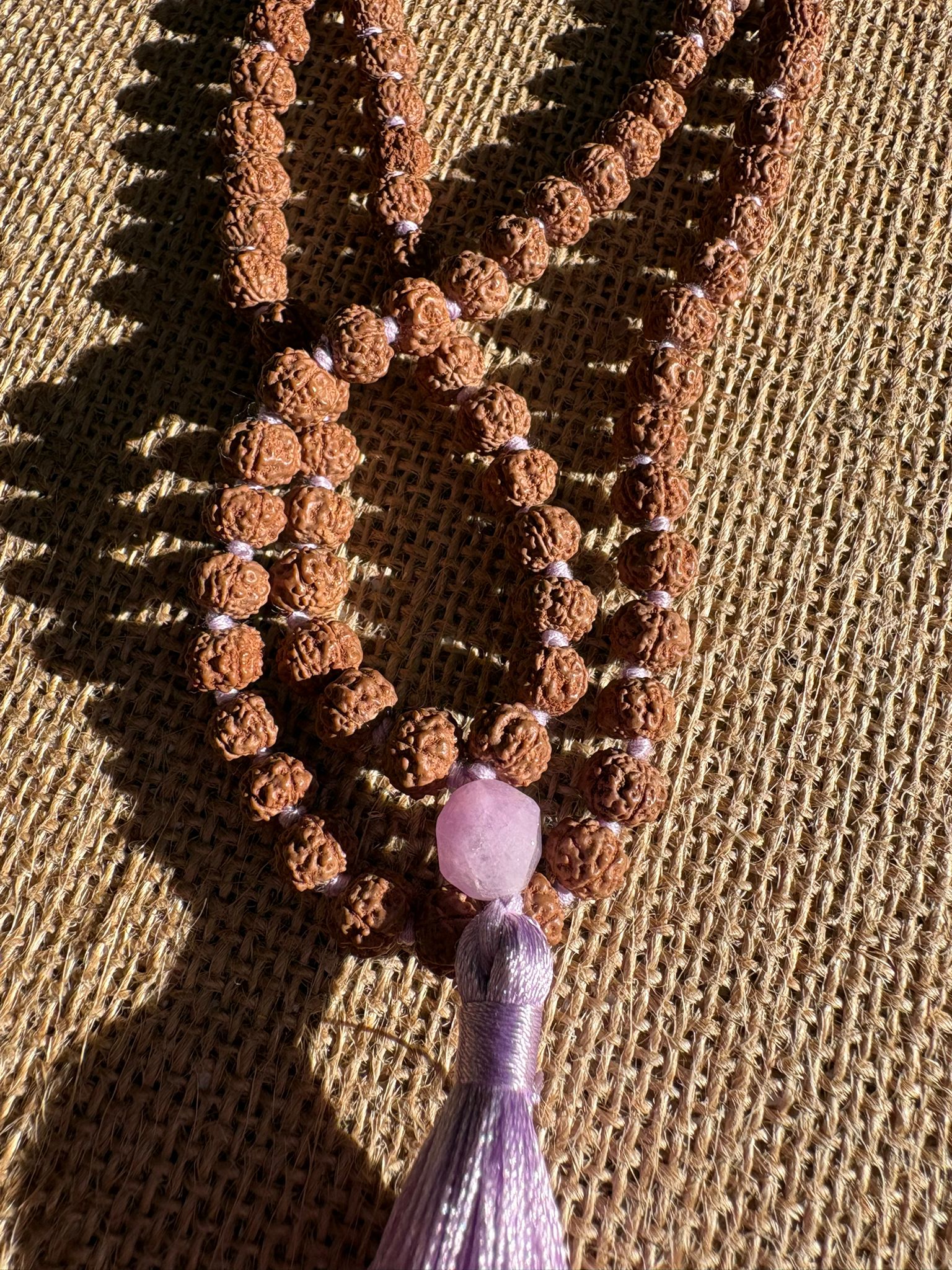 Ce Mala Rudrakshas avec perle du Guru en Kunzite est une alliance subtile entre la force ancestrale des Rudrakshas et la douce énergie du cœur portée par la Kunzite. Un mala à la vibration à la fois protectrice et profondément apaisante.